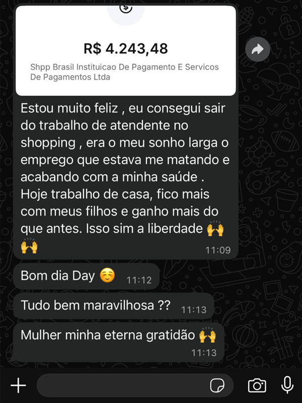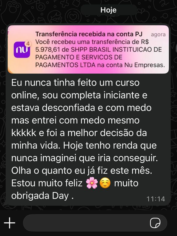 Muito Prazer, eu me chamo : Dayane Marques , sou cristã, casada e mãe de três filhos. Desde que entrei no marketing digital, meu maior objetivo sempre foi mudar a minha própria realidade e consegui. Mas não parei por aí. Transformei cada aprendizado, cada desafio e cada vitória em um método prático para que outras pessoas também pudessem conquistar sua independência financeira.